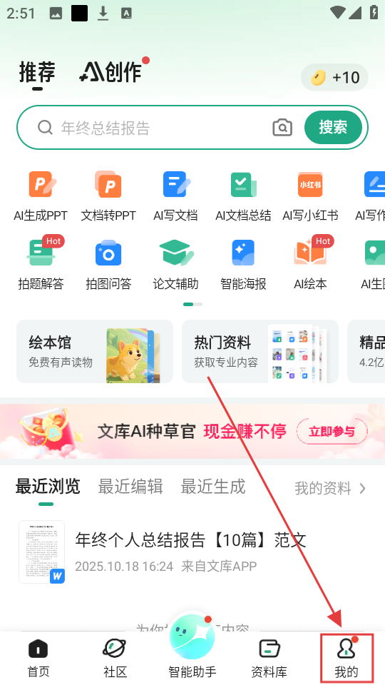 1、打开APP首页,点击底部【我的】选项,进入个人中心页面,准备创建新文档啦。