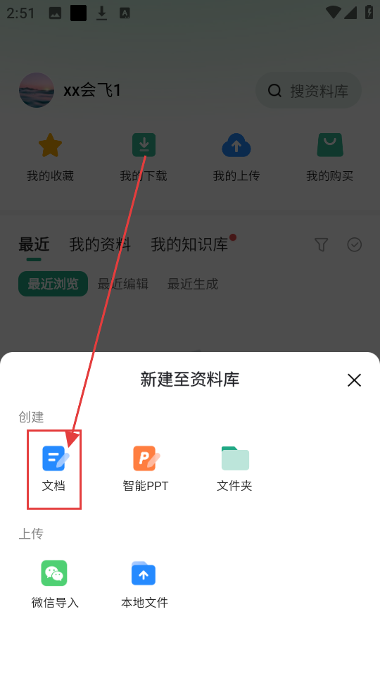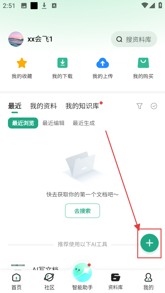 2、在个人中心页面,点击右下角绿色加号按钮,展开新建文档等选项,可选择创建类型哦。