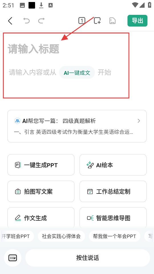 4、在文档编辑页面,输入标题和内容,也可使用AI一键成文等功能辅助创作,完成文档创建啦。