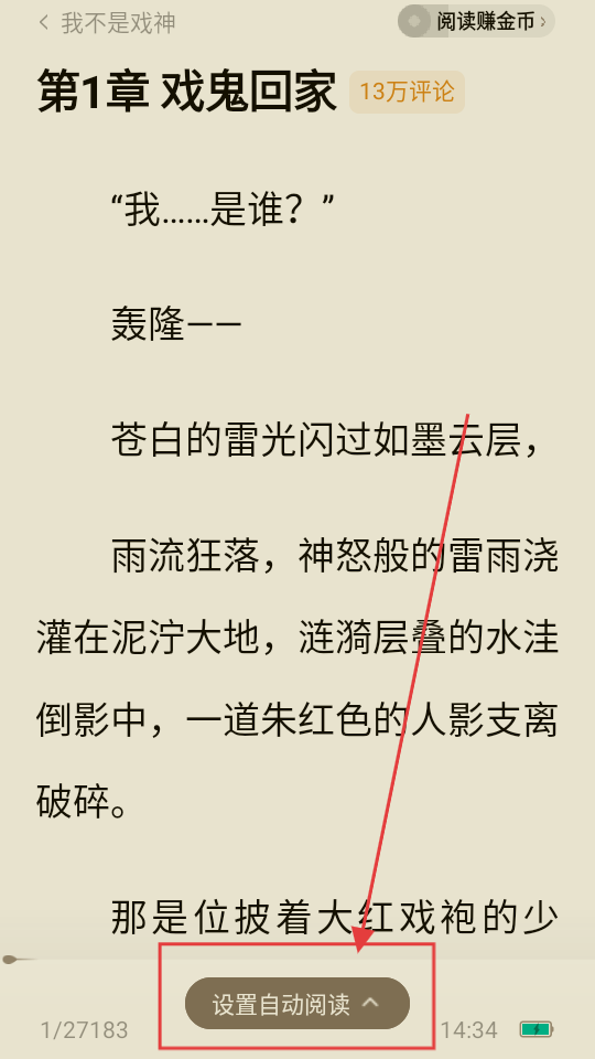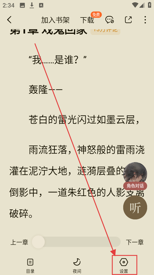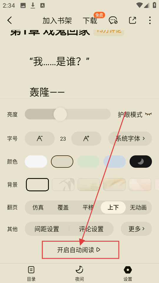 1、在阅读页面,点击右下角【设置】按钮,就能进入阅读设置界面,开启自动阅读等操作啦。