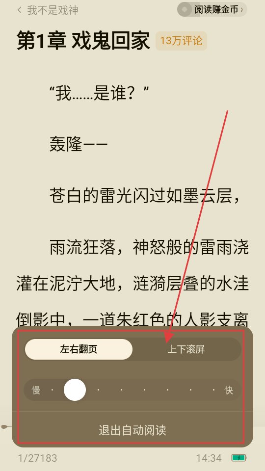 4、在自动阅读设置页面,可选择【左右翻页】或【上下滚屏】,还能调节阅读速度,超灵活哟。