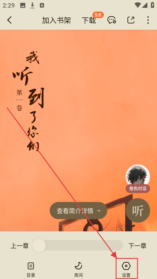 1、在阅读页面,点击右下角【设置】按钮,就能进入阅读设置界面,调整阅读相关参数啦。