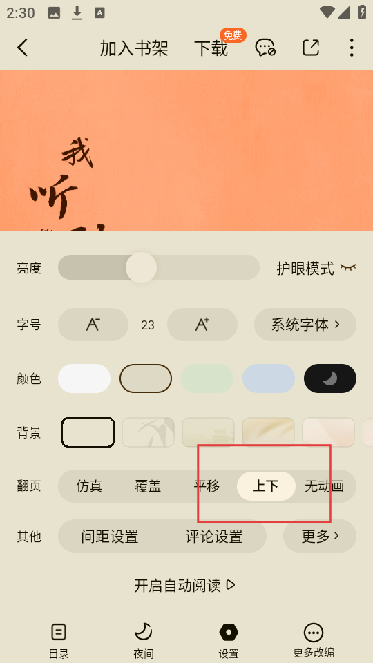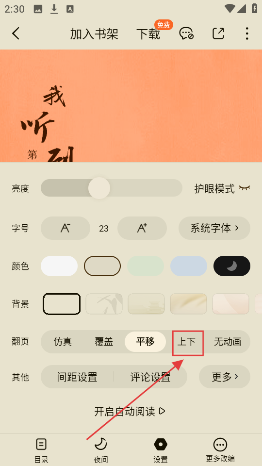3、选择【上下】翻页方式后,就能按上下滑动的方式来翻页,让阅读操作更顺手哟。