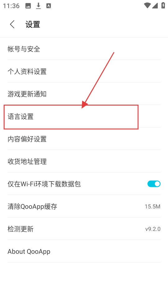 3、在设置页面,点击【语言设置】,可进入语言设置页面,选择软件显示语言啦。