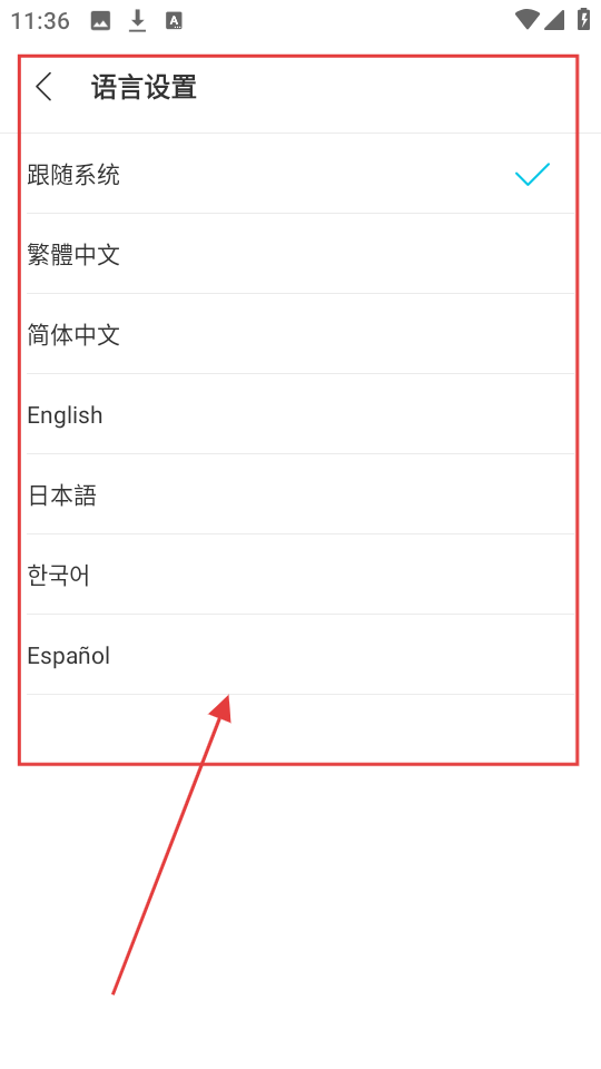 4、进入语言设置页面后,可选择跟随系统、繁體中文、简体中文等语言,完成语言设置哦。