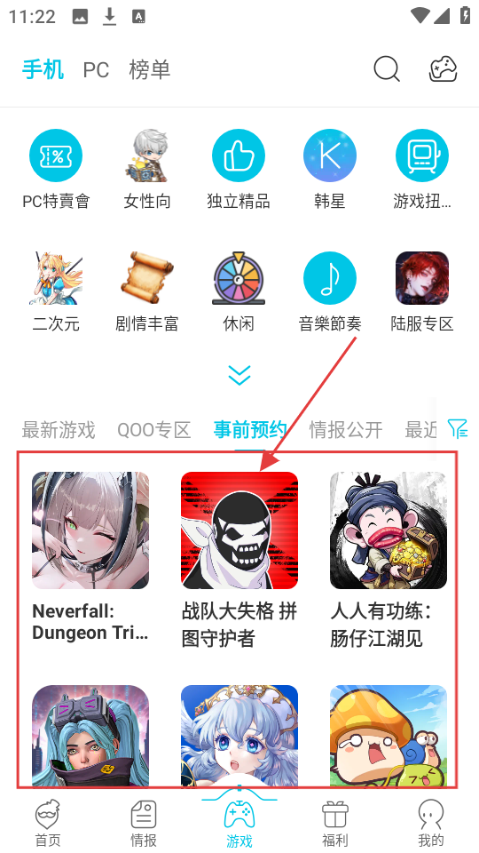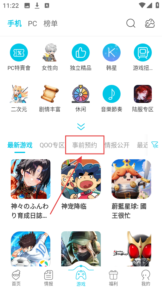 1、在软件游戏页面,点击【事前预约】,可进入事前预约游戏列表,查看可预约的游戏啦。
