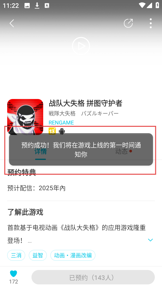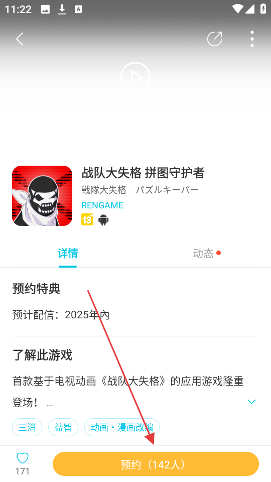 3、在游戏详情页,点击【预约】,可预约该游戏,预约成功后将在游戏上线时收到通知啦。