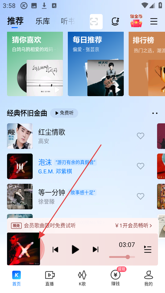 1、我们进入软件首页,能看到推荐的歌曲,若想听某首歌,点击歌曲进入播放页面吧。