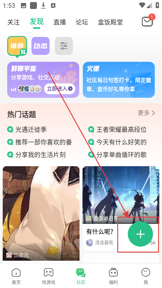 2、在社区界面看到绿色【+】按钮,点它就能创作内容啦,分享你的游戏故事吧。
