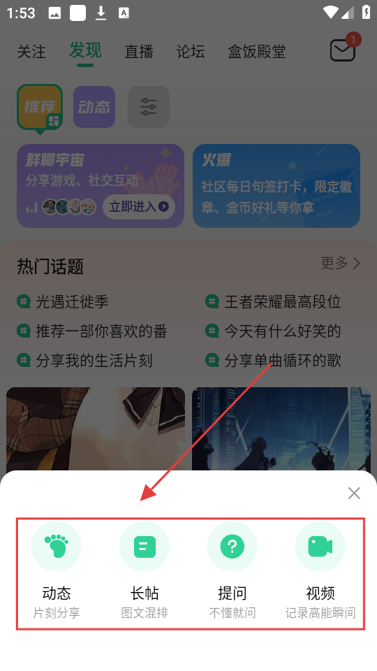 3、创作时可选【动态】【长帖】等类型哦,根据需求选,让你的分享更出彩呢。