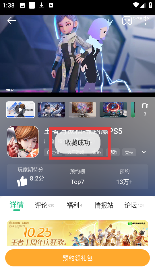 4、点【收藏】后会显示【收藏成功】,这样就把游戏收藏好啦。