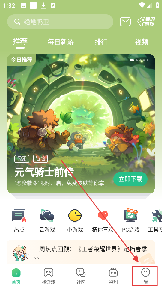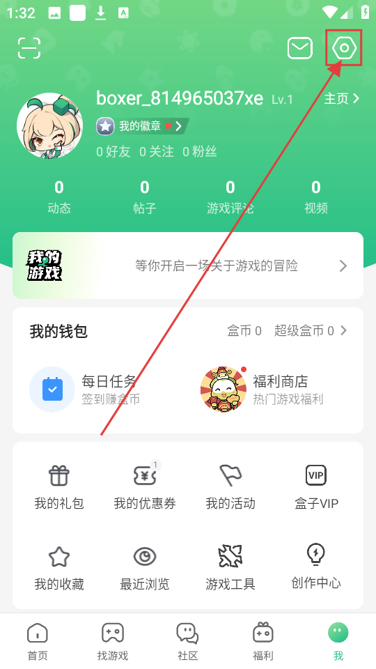 1、打开4399游戏盒之后,点击“我”,选择右上角设置按钮;