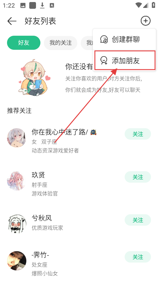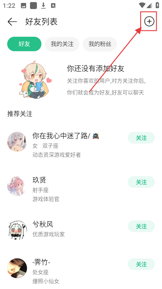 2、进入好友列表后,点右上角【+】按钮呀,展开添加好友的选项啦。