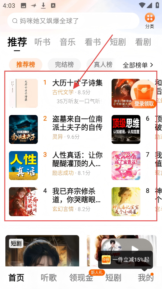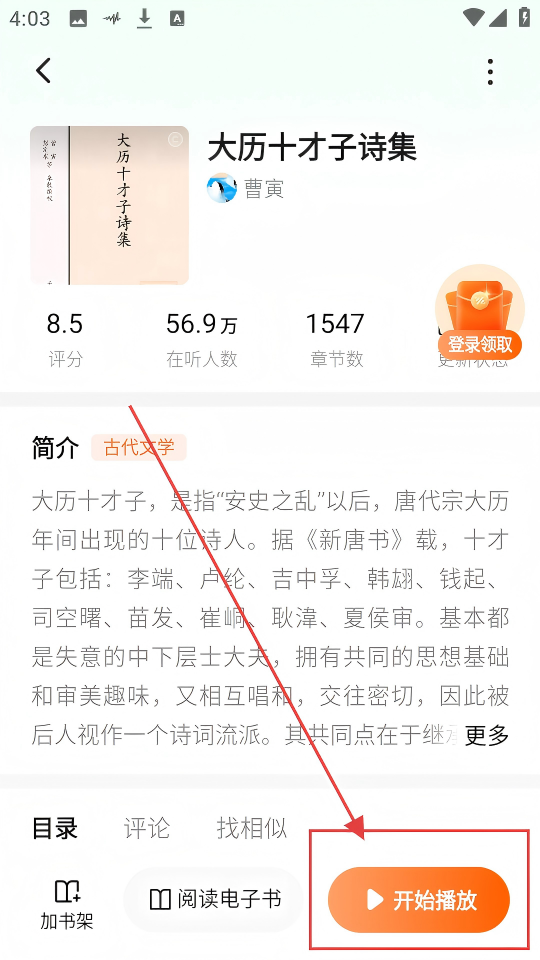 1、在首页推荐榜里,找到感兴趣的听书内容,像【大历十才子诗集】就很不错,快选它开启听书吧。