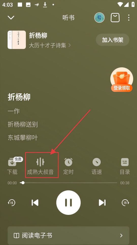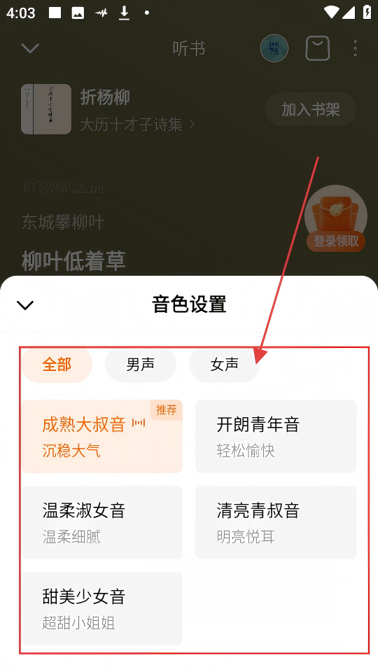 3、在听书播放页面,点击【成熟大叔音】按钮,就能展开音色设置选项,去挑选喜欢的音色吧。