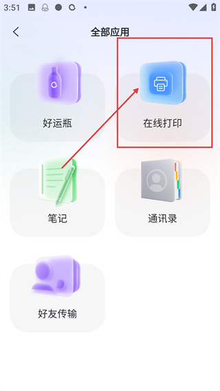 1、在全部应用页面,点击【在线打印】选项,进入对应的功能界面,可使用文档打印等服务啦。