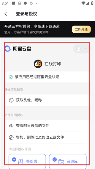 4、在登录与授权页面,确认阿里云盘的授权范围后,完成授权操作,即可继续使用在线打印的功能啦。