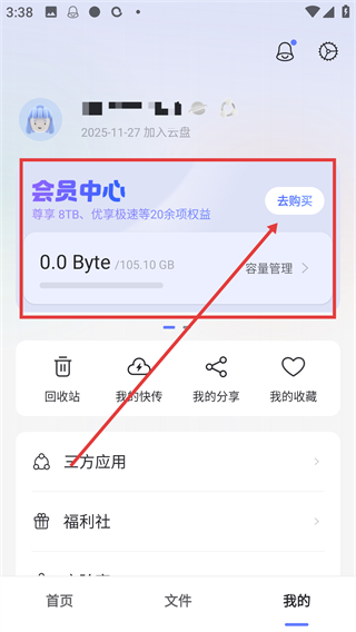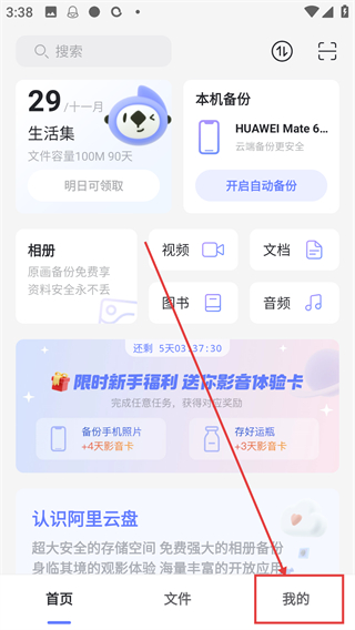 1、在阿里云盘APP的首页,点击底部的【我的】选项,进入个人中心界面,可查看账号及会员相关信息啦。