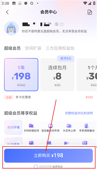 3、在会员中心页面,选定目标套餐(如1年-198元)后,点击【立即购买¥198】按钮,触发协议确认弹窗呀。