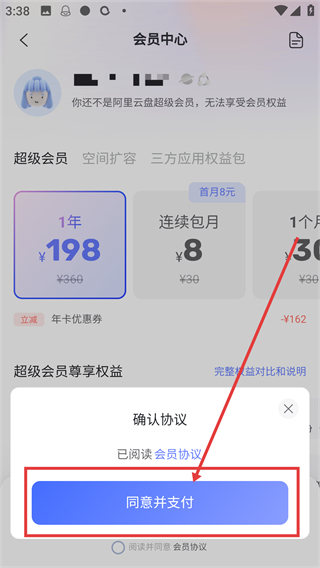 4、在确认协议弹窗中,点击【同意并支付】按钮,即可进入支付流程,完成会员套餐的购买啦。