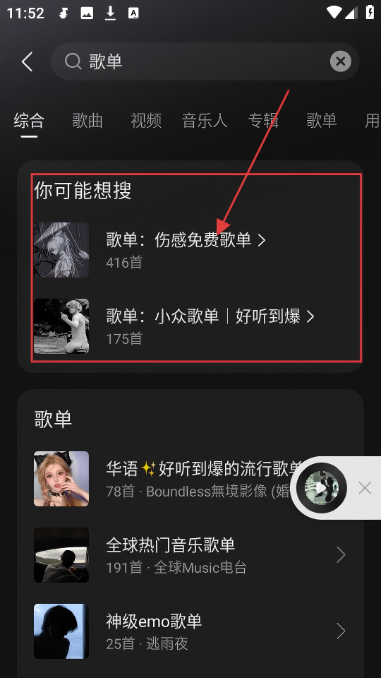 2、搜索“歌单”后,会有“你可能想搜”板块,像【歌单:伤感免费歌单】等,选喜欢的歌单能发现好音乐呢。
