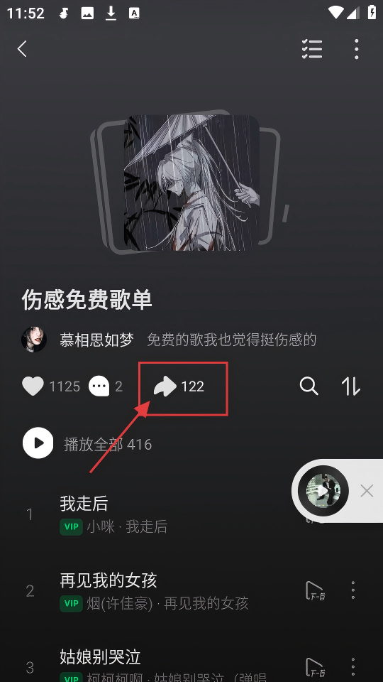 3、进入【伤感免费歌单】页面,能看到分享按钮,点击它,可把歌单分享给朋友,一起享受音乐啦。