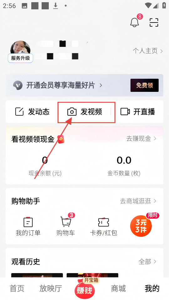 2、在个人页面,看到【发视频】选项,点击它,就能进入发视频的准备界面啦。