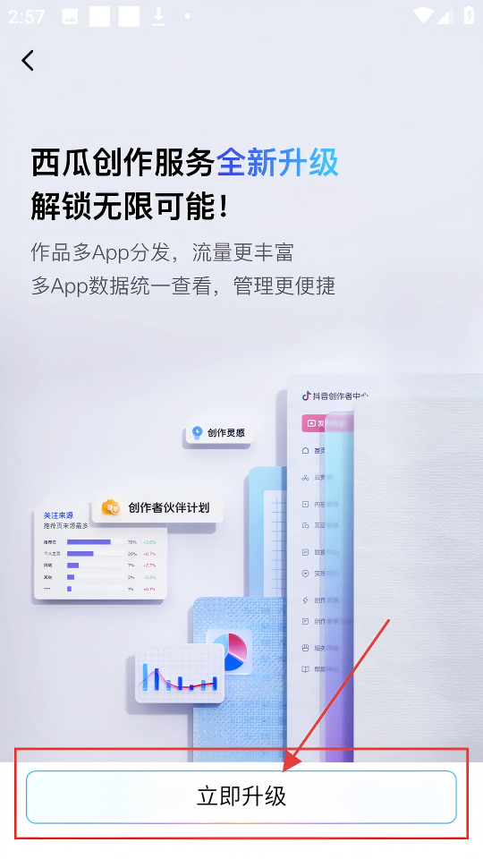 4、进入升级页面,再次点击【立即升级】,完成西瓜创作服务升级,解锁更多创作可能。