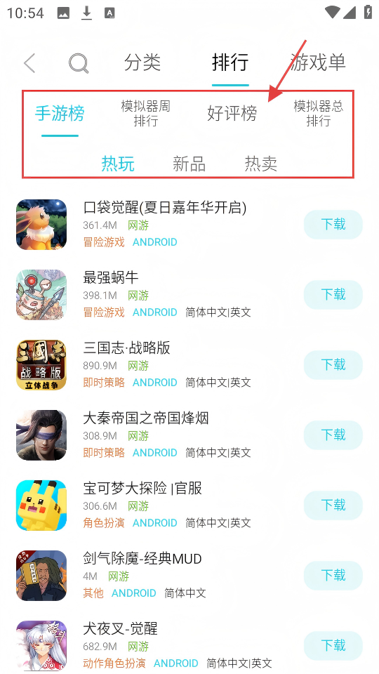 3、排行页面中,有【手游榜】【好评榜】等分类,选喜欢的榜单,能找到对应优质游戏。