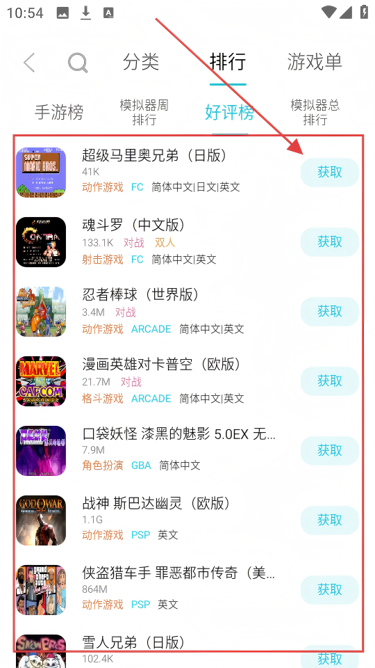 4、进入【好评榜】,看到超多好评游戏,选心仪的点击【获取】,就能拥有游戏啦。