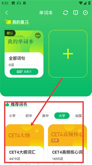 3、进入单词本页选【CET4大纲词汇】这类词书,能查看对应词汇列表,方便积累英语单词哦。