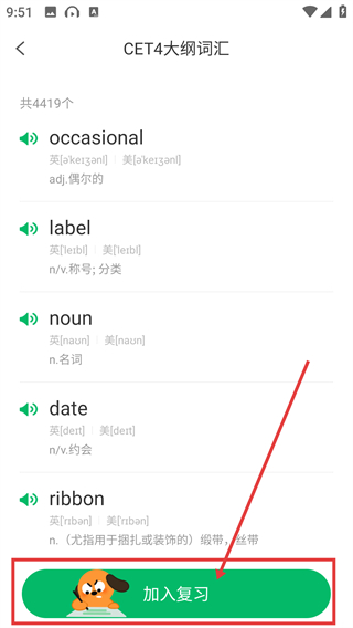 4、在词汇详情页点【加入复习】按钮,能把当前词汇添加到复习列表,后续可针对性巩固哦。