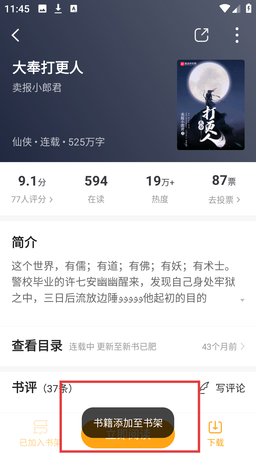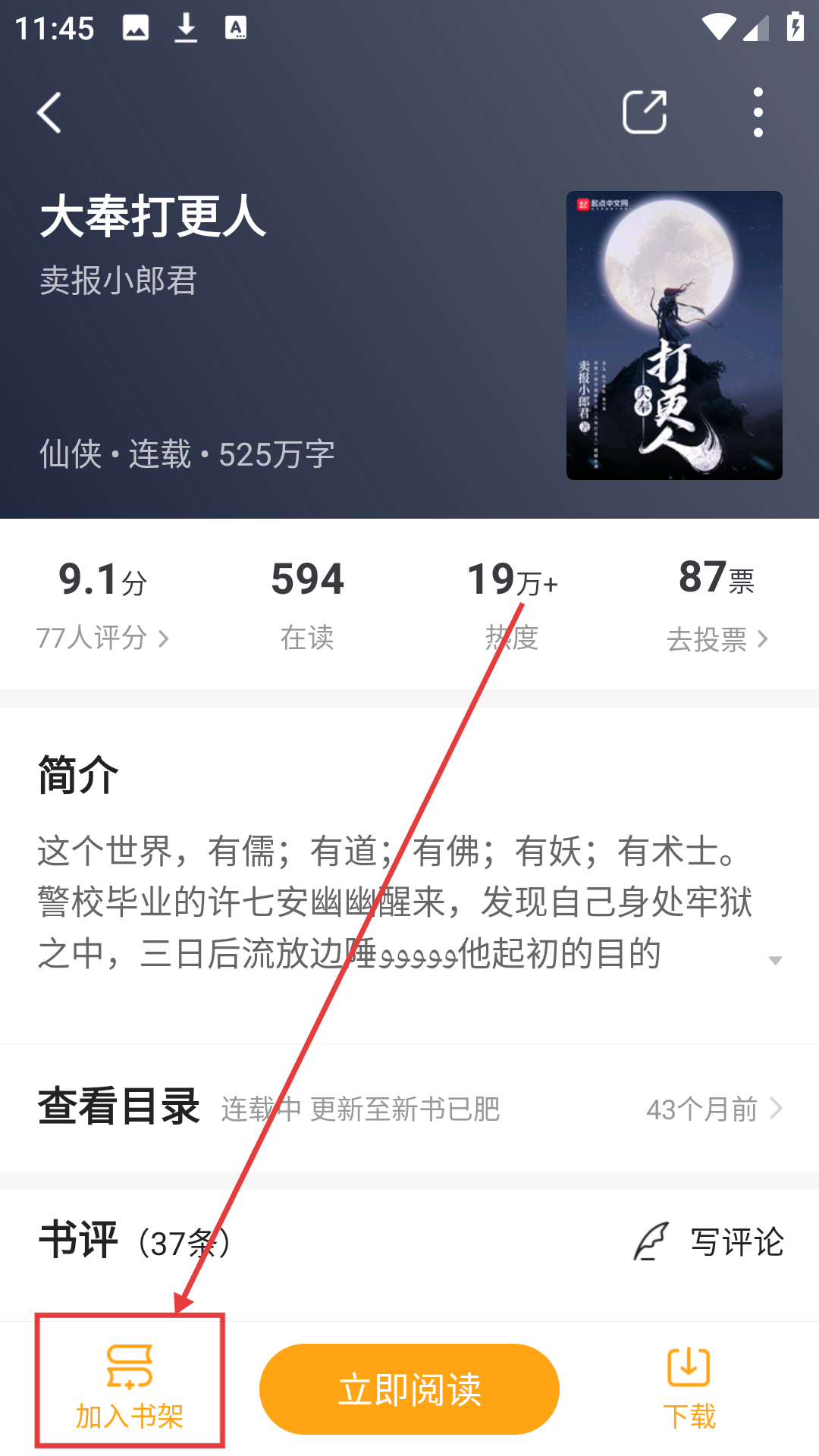 2、进入小说详情页后,点击【加入书架】,可将该小说添加到书架哦。