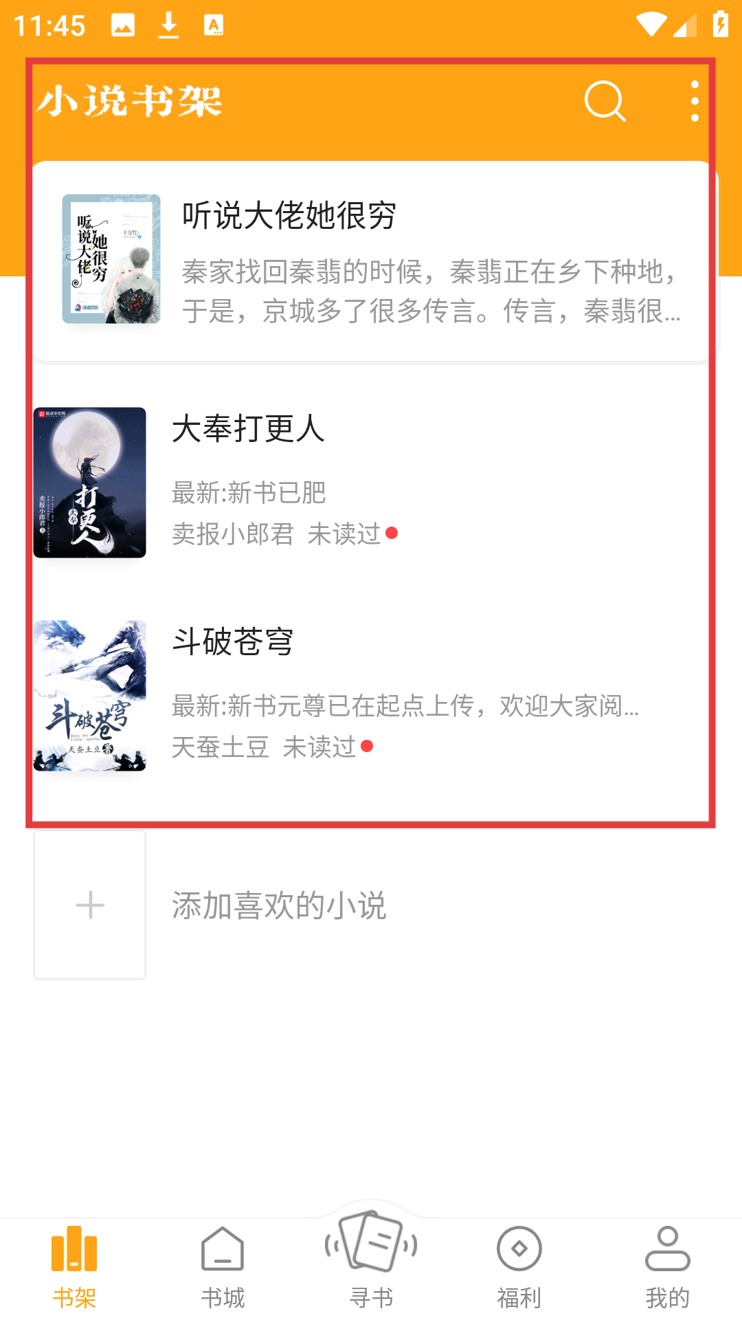 4、进入书架页面,可看到已添加的《大奉打更人》等小说,方便后续随时阅读哦。