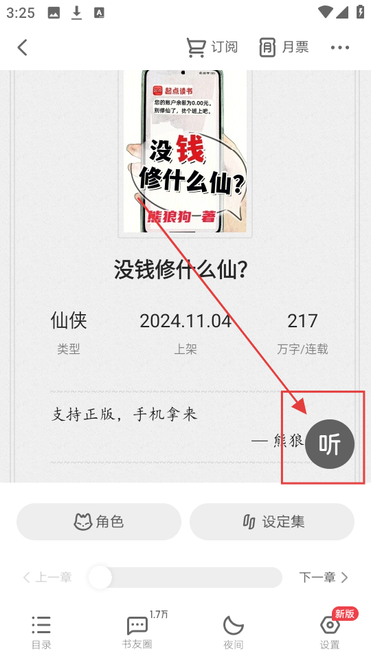 2、进入书籍详情页后,找到【听】按钮,点击它就能进入听书模式,开始聆听书籍内容。