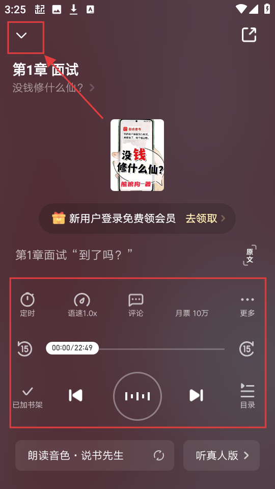 3、进入听书模式后,下方出现听书控制栏,能进行定时、调节语速等操作,点击左上角的图标可以收起听书页面。