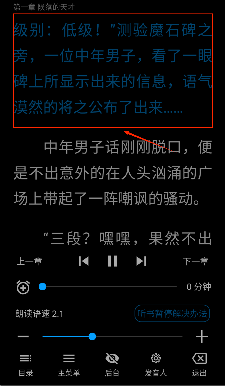 4、如果听到精彩处想查看文字,可以一键切换回阅读模式,系统会自动记录听到的位置不会丢失进度啦。