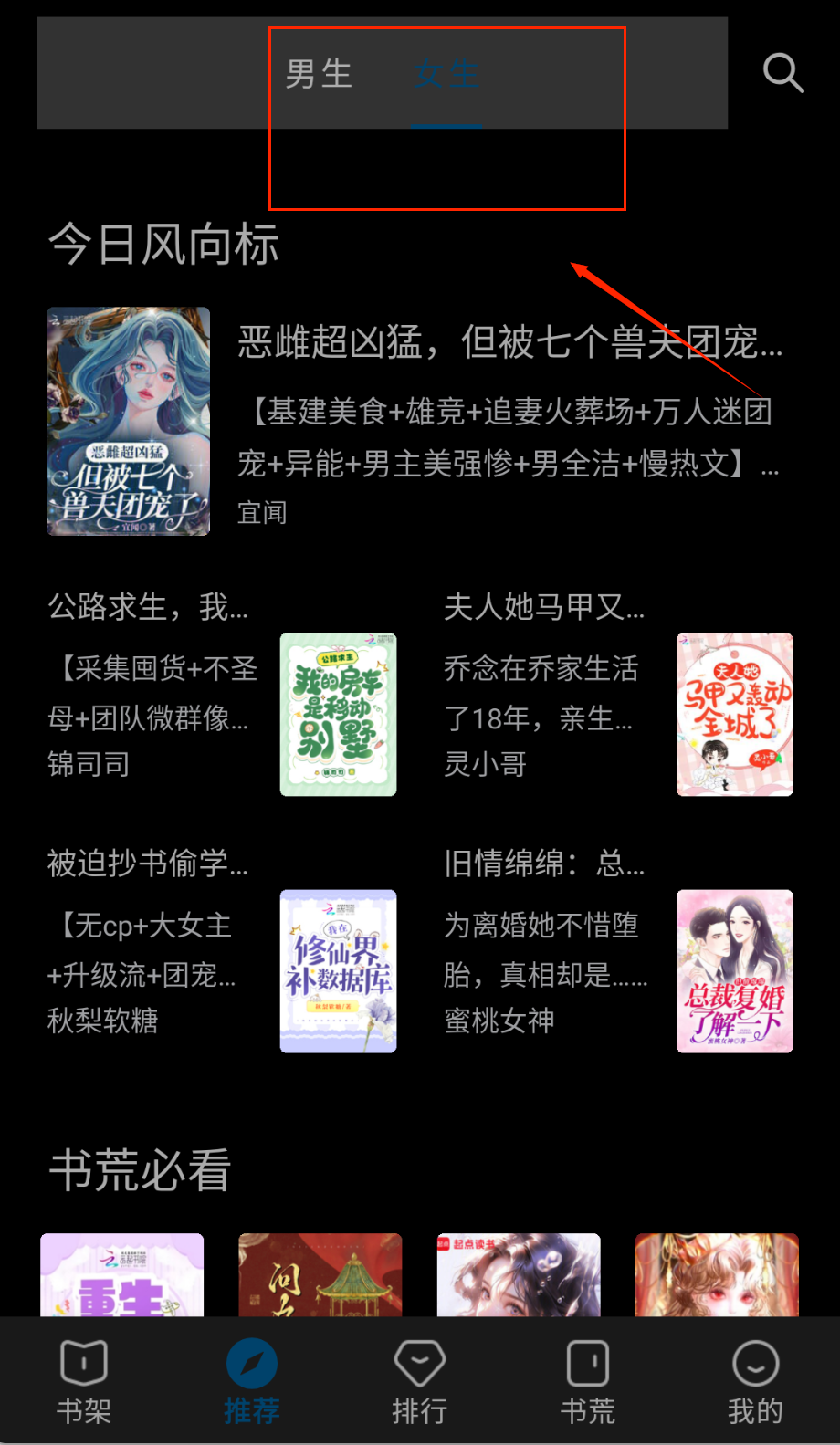 1、在主页面可以通过性别频道快速筛选内容,男生频道主打玄幻武侠类作品,女生频道侧重言情都市小说,方便你快速定位喜好。