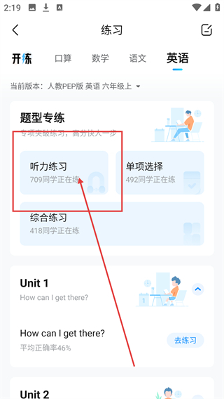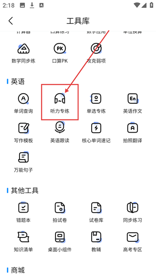 1、在工具库界面,找到【听力专练】功能入口并点击,进入英语听力的练习专区,可开启听力训练啦。