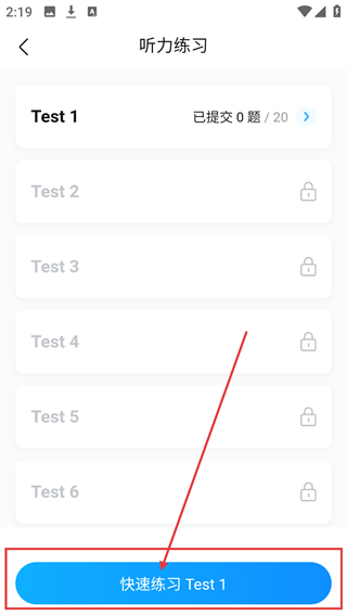 3、在听力练习页,点击【快速练习Test1】按钮,即可开始该套听力题的训练,逐步完成题目呀。