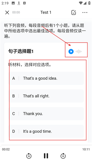 4、进入Test1练习后,点击音频播放按钮听取内容,再从选项中选择对应答案,完成听力题的作答啦。