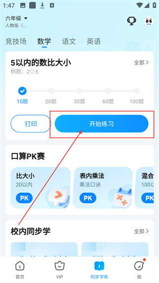 3、切换到同步学练页,选择【5以内的数比大小】模块,点击【开始练习】就能开启对应训练啦。
