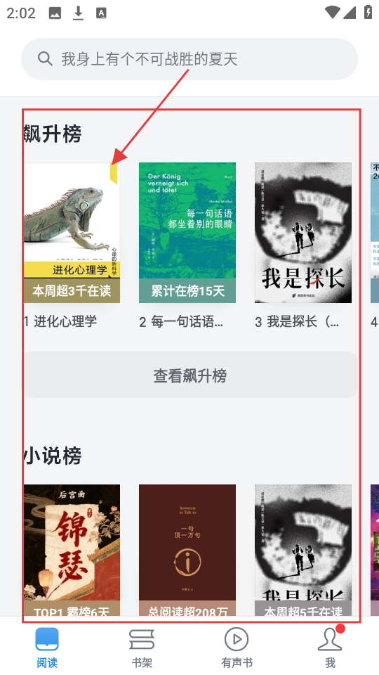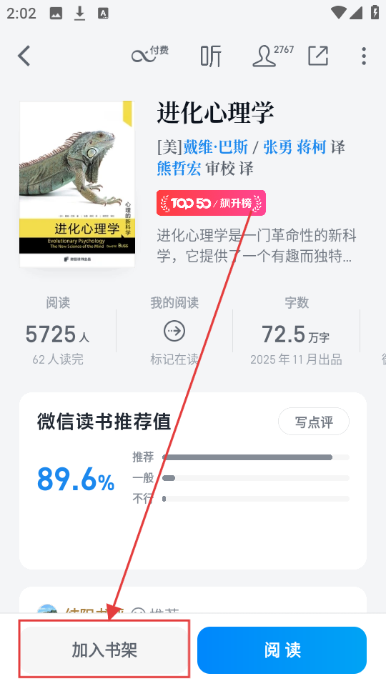 1、阅读页选飙升榜《进化心理学》,进入详情页,了解书籍信息哦。