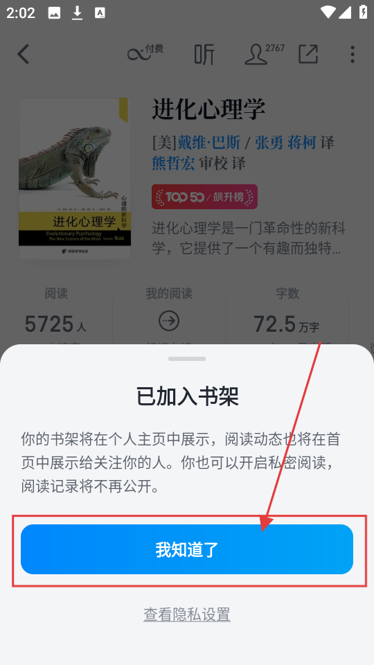 3、加入书架后点【我知道了】,确认书籍成功加入,超简单呢。