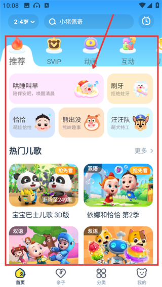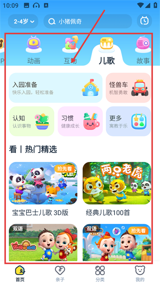 3、切换到【儿歌】分类页,能看到入园准备、认知等板块,还有热门精选的儿歌内容可挑选哦。