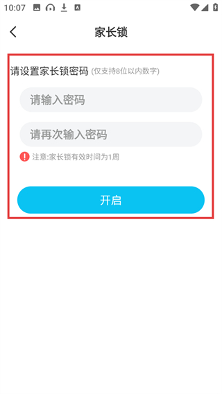 3、在家长锁页面输入8位以内数字密码并再次确认,点击【开启】按钮就能启动家长锁功能哦。
