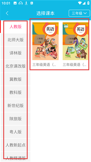 3、在课本选择页选教材版本,比如【人教版】,再选对应年级的课本,就能选定听写内容啦。