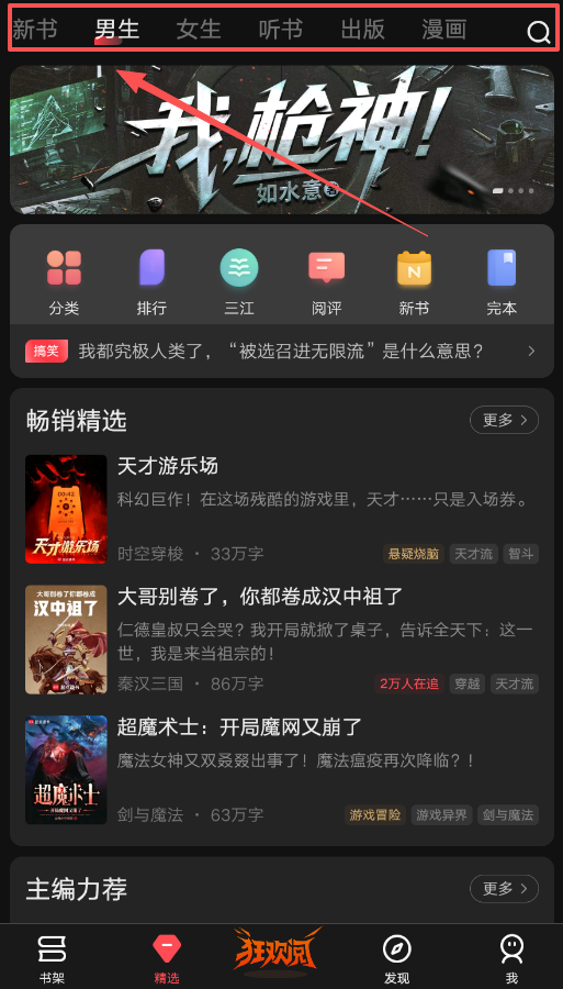 1、主页面顶部有新书、男生、女生等分类标签,方便根据喜好筛选作品类型。