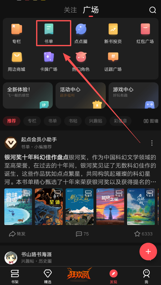 2、发现页面提供了丰富的社区互动功能,包括书单推荐、专栏文章和话题广场。