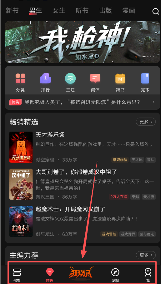 1、主界面顶部有新书、男生、女生等分类标签,可以根据喜好快速筛选作品类型,底部导航栏有书架、精选、发现和我四个核心入口。